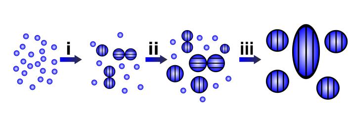 | Fig. 3 Left: Proposed stages of FePt NP formation process: (i) rapid formation of a large number of FePt NPs nuclei; (ii) subsequent growth of larger particles, here both OA and OR happen; (iii) slow growth of particles at expense of smaller clusters via an OR process. (The dots represent the atomic monomer, and the circles with stripes represent the particles.) | Right: Two growth process of OR and OA nucleation and growth process captured by TEM and the final morphology of quasi-round and nano-rod shape FePt NPs. |