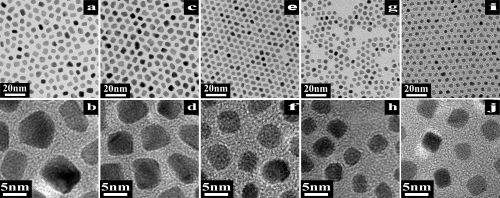 Fig. 4 TEM images of FePt NPs with a mean size of (a) 5.1 nm; (c) 4.7 nm; (e) 4.3 nm; (g) 4.0 nm and (i) 3.6 nm synthesized from Fe(CO)x-OAm with molecular ratios of OAm: Fe(CO)5 of 1 : 1, 2 : 1, 3 : 1, 4 : 1 and 5 : 1, respectively. (b), (d), (f), (h) and (j) are respectively the magnified images of (a), (c), (e), (g) and (i). |