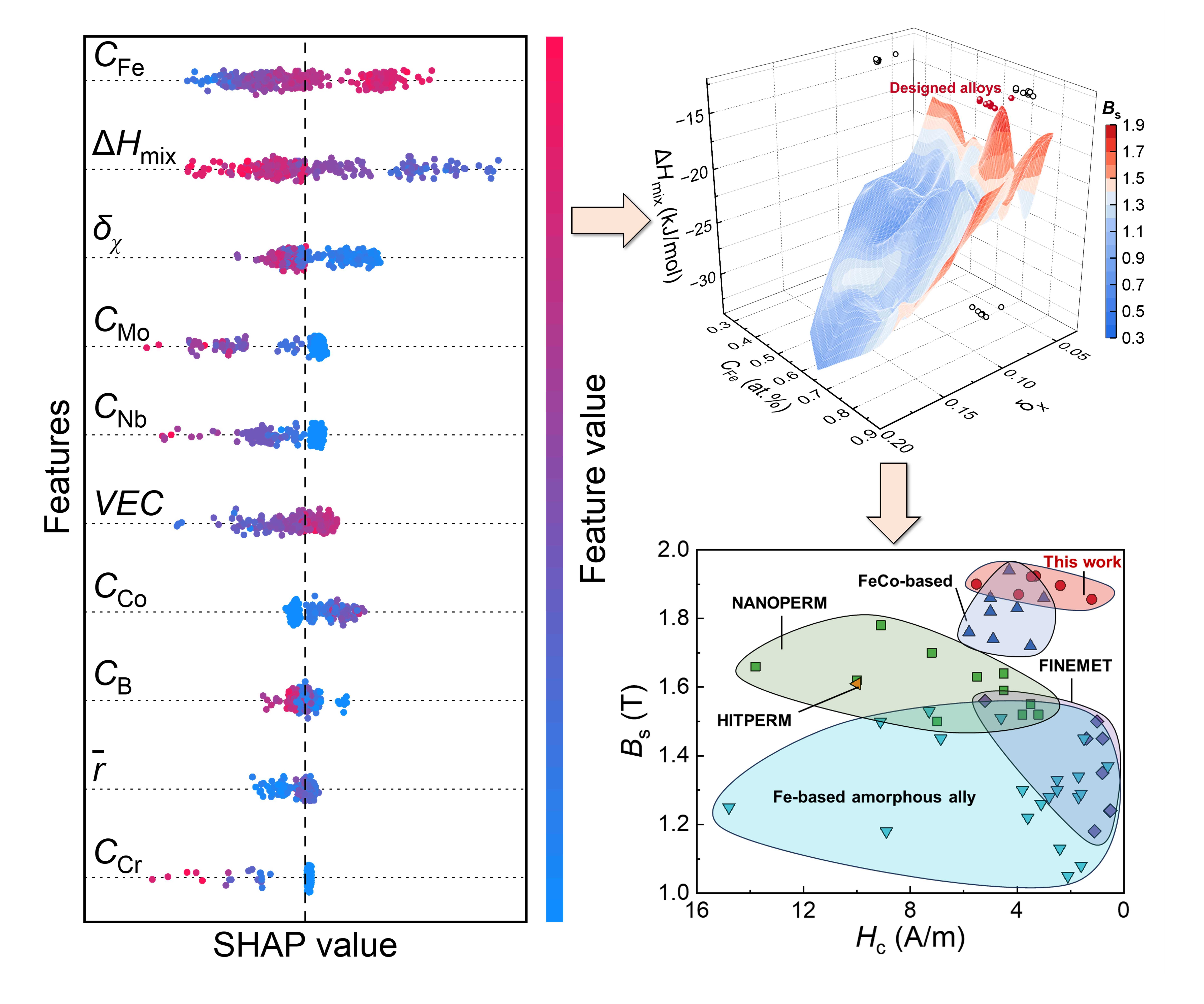 Through feature analysis, the iron content (above 75 atomic percent), mixing enthalpy (-18.7 to -14 kJ/mol), and electronegativity difference (below 0.07) are identified as key factors driving high Bs while preserving glass-forming ability.