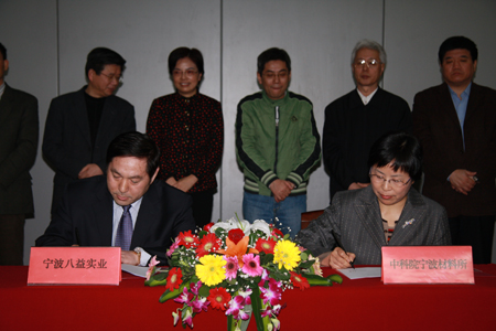 On March 29, 2010, Prof. Jin Zhu’s research team from NIMTE (CAS) signed a cooperation agreement with Bayi Industrial Co., Ltd to industrialize the research achievement of “Bio-based Formaldehyde-free Wood Binder”. Mr. Erwei Shi, vice-present of Chinese Academy Sciences (CAS) and Ms. Hongyi Yu, deputy mayor of Ningbo both attended the singing ceremony.