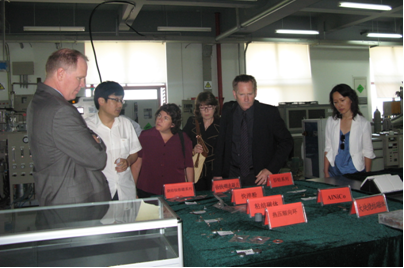 The visitors first looked around the laboratories of Functional Materials and Nano-Device Division. Prof. Gao Jie Xu introduced the equipments and exhibit to them. Then the visiting team moved to laboratories of Surface Engineering and Remanufacturing Division. Prof. Zhen Lun Song and Prof. Ai Ying Wang welcomed them. They also visited laboratories of Polymer and Composite Division and Magnetic Materials and Devices Division.