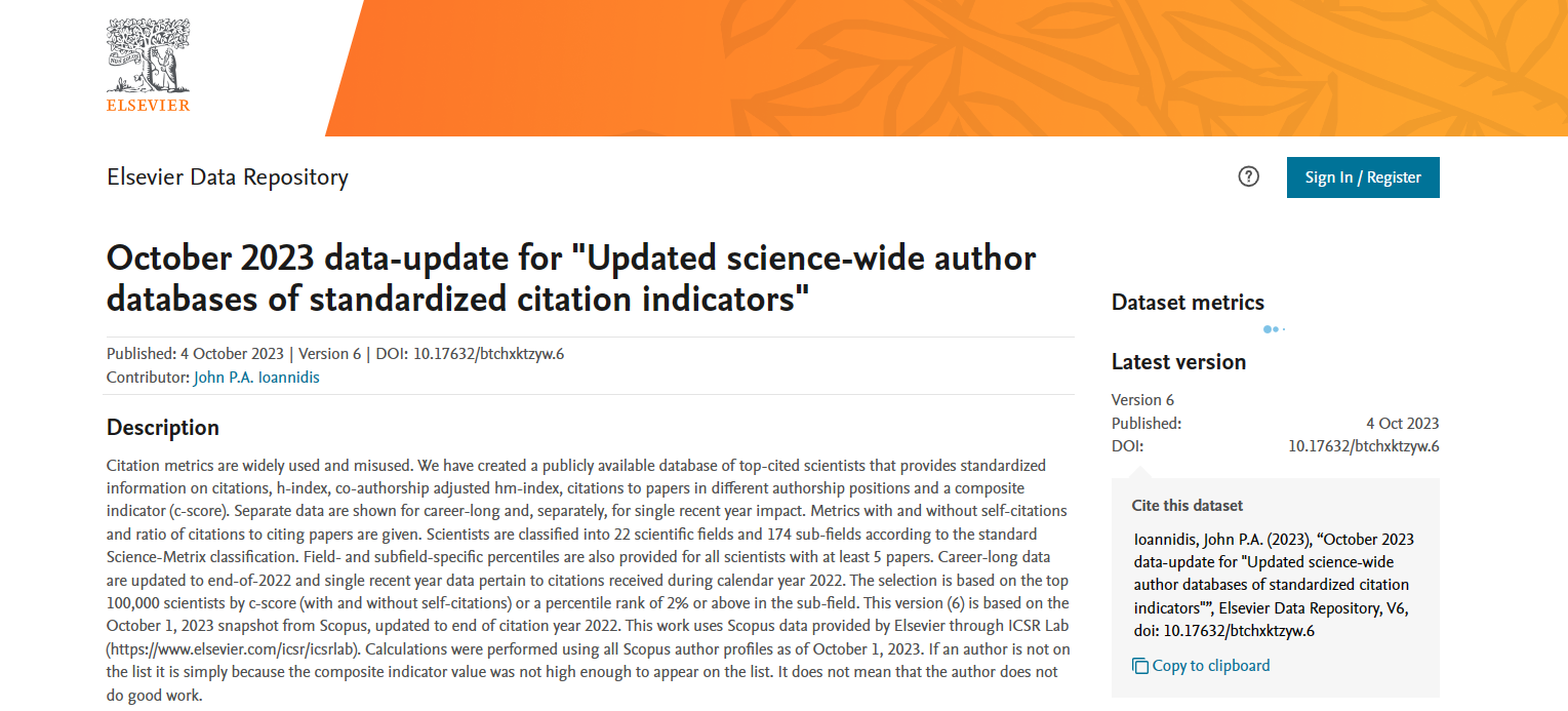 Based on the Scopus database of over 100,000 top-scientists that provides standardized information on citations, h-index, co-authorship adjusted hm-index, citations to papers in different authorship positions and a composite indicator, this prestigious list can reflect the global influence and research excellence of scholars.